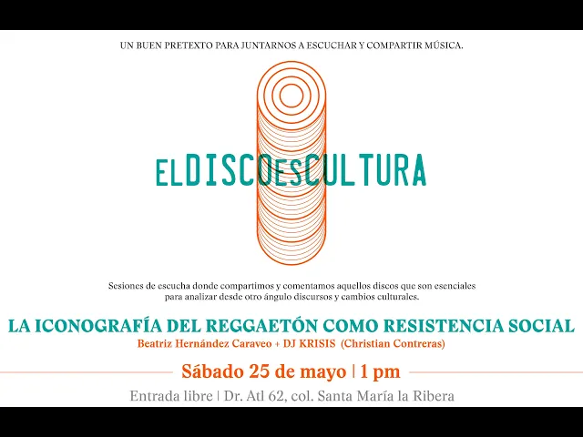 Beatriz Caraveo compartió su investigación sobre semiótica de la imagen y la cultura visual del reggaetón, con la que obtuvo el grado de Maestría en Ciencias y Artes del Diseño por la UAM, acompañada de DJ Krizis (Christian) productor y promotor mexicano de reggaetón. Charlamos sobre la construcción de identidad, reproductibilidad en la era postdigital, feminismos y migración.